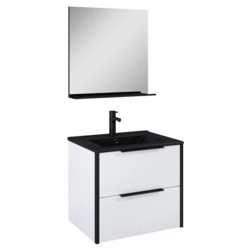 De Atlantic badmeubelset Aria met spiegel en zwarte wastafel 60cm Mat Wit is een hangende set met een industriele uitstraling. Dankzij het hangende design creëer je een ruimtelijke look in jouw badkamer. Het meubel is voorzien van 2 soft close laden en een mat zwarte keramische wastafel. Ook zijn er zwarte profielen geplaatst op de randen van het badmeubel voor een extra stoere look. Daarnaast is aan deze set een losse vierkante spiegel met planchet toegevoegd. De set is voorzien van stijlvolle mat zwarte grepen, wat zorgt voor een chique en industrieel uiterlijk. De set wordt flatpacked geleverd en is eenvoudig te installeren met de meegeleverde bevestigingsmaterialen. Exclusief wastafelkraan.