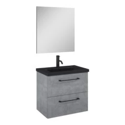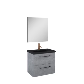 De Atlantic badmeubelset Sienna met spiegel en zwarte wastafel 60cm beton is een hangende set met een chique uitstraling. Dankzij het hangende design creëer je een ruimtelijke look in jouw badkamer. Het meubel is voorzien van 2 soft close laden en een mat zwarte keramische wastafel. Daarnaast is aan deze set een losse spiegel toegevoegd. De set is voorzien van stijlvolle zwarte grepen, wat zorgt voor een chique en industrieel uiterlijk. De set wordt flatpacked geleverd en is eenvoudig te installeren met de meegeleverde bevestigingsmaterialen. Exclusief wastafelkraan.ngsmaterialen. Exclusief wastafelkraan.