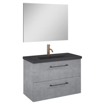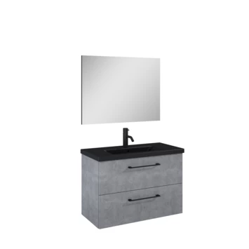 De Atlantic badmeubelset Sienna met spiegel en zwarte wastafel 80cm beton is een hangende set met een chique uitstraling. Dankzij het hangende design creëer je een ruimtelijke look in jouw badkamer. Het meubel is voorzien van 2 soft close laden en een mat zwarte keramische wastafel. Daarnaast is aan deze set een losse spiegel toegevoegd. De set is voorzien van stijlvolle zwarte grepen, wat zorgt voor een chique en industrieel uiterlijk. De set wordt flatpacked geleverd en is eenvoudig te installeren met de meegeleverde bevestigingsmaterialen. Exclusief wastafelkraan.ngsmaterialen. Exclusief wastafelkraan.