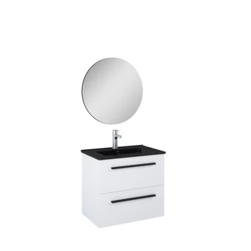 De Atlantic badmeubelset Stella met spiegel en zwarte wastafel 60cm Mat Wit is een hangende set met een chique uitstraling. Dankzij het hangende design creëer je een ruimtelijke look in jouw badkamer. Het meubel is voorzien van 2 soft close laden en een mat zwarte keramische wastafel. Daarnaast is aan deze set een losse ronde spiegel toegevoegd. De set is voorzien van stijlvolle mat zwarte grepen, wat zorgt voor een chique en industrieel uiterlijk. De set wordt flatpacked geleverd en is eenvoudig te installeren met de meegeleverde bevestigingsmaterialen. Exclusief wastafelkraan.