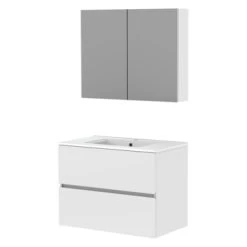 De DONNA badkamermeubel-set met een spiegelkast geeft een modern tintje aan uw badkamer en brengt u extra opbergruimte.