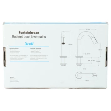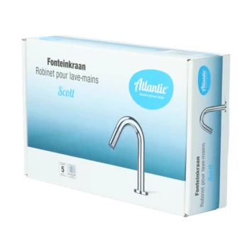 De Atlantic fonteinkraan Scott met draaiknop Chroom bestaat uit een chromen fonteinkraan van 17,8 cm hoog, bevestigingsmateriaal en montagehandleiding. De kraan heeft een diepte van slechts 11,2 cm en is daarmee uitermate geschikt voor gebruik in het toilet. De Scott fonteinkraan zet je open met de draaiknop op het uiteinde van de kraanuitloop. Aan de anti-kalk perlator hecht kalk zich moeilijk vast en veeg je er gemakkelijk met de hand af. De ronde c-vormige kraan heeft een glanzende chromen afwerking. Gebruik alleen water en een zachte doek om de kraan schoon te maken. Gebruik geen schurend, bijtend, azijnhoudend of agressief schoonmaakmiddel. Op de kraan heb je 5 jaar garantie.
