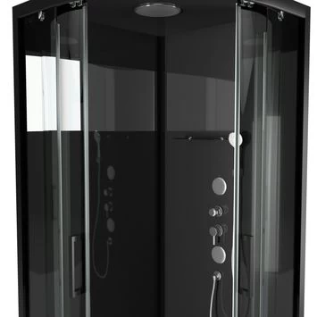 Deze strak ontworpen zwarte douchecabine van Aurlane is perfect wanneer je iets minder ruimte in de badkamer hebt. De cabine beschikt namelijk over een dubbele schuifdeur in de hoek. Daardoor heb je geen extra ruimte nodig om de deuren te kunnen openen. De hoekinstap heeft een opening van 50 cm in de breedte en de wanden zijn gemaakt van 4 mm dik veiligheidsglas. Daar bovenop heeft de cabine een ingebouwde regendouche, een handdouche en 2 grote waterjets. De douchebak van deze Aurlane Douchecabine met Schuifdeur Black Mirror 2 Kwartrond Zwart 90×90 cm heeft een ondersteuningsframe met 5 steunpoten. De hele set bestaat uit een centrale douchekolom, een douchebak, een voorzijde in zwart veiligheidsglas van 4 mm dik en een set achterwanden in zwart acryl. Deze cabine is ook beschikbaar in een vierkante en rechthoekige uitvoering.