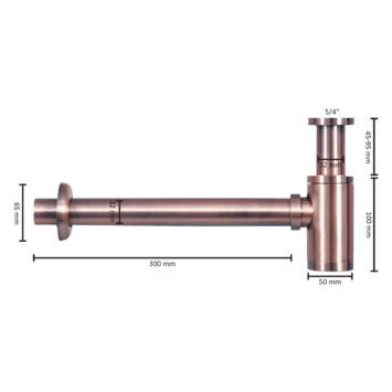 Breng je fonteinset in je toiletruimte in één stijl met de sifons van Differnz! Deze prachtig vormgegeven bekersifon monteer je eenvoudig. Het afvoer heeft een diameter van 5/4″ en de afvoerbuis is 32 mm in doorsnede. Vanwege zijn mooie vormgeving en rood koperen afwerking, combineer je de Differnz sifon rood koper goed met een vrij hangende wastafel of fontein.