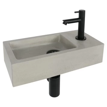 Fonteinset Jukon beton past met zijn betonlook en zwarte kraan perfect een trendy toilet. De sifon is net als de kraan zwart afgewerkt, waardoor een mooi geheel ontstaat. De kraan en de sifon zijn meegeleverd. De fontein zelf is gemaakt van beton en 38,5×18,5x9cm groot.