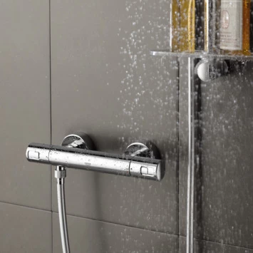 De Grohe Thermostatische Douchekraan Precision Joy Chroom 15 cm is geschikt voor moderne badkamers waar de hart-op-hart afstand tussen de koud- en warmwaterleiding 150 mm is. Deze thermostatische douchekraan zorgt voor een heerlijke douche met een constante watertemperatuur, ook al zijn er fluctuaties in de waterdruk. Met de SafeStop knop op 38°C voorkom je dat je kinderen de temperatuur verhogen, terwijl je dankzij de volumegreep met GROHE EcoButton tot 50% water kunt besparen. De kraan is voorzien van GROHE TurboStat: hiermee wordt snel en continu de gewenste temperatuur bereikt.