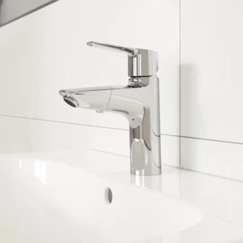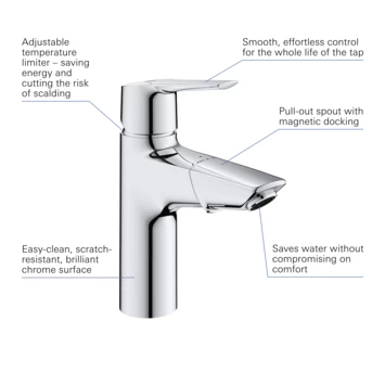 Met de waterbesparende GROHE Start wastafelkraan maak je jouw moderne badkamer helemaal up-to-date. Deze vernieuwde eengreeps wastafelkraan met handige pop-up waste is ontworpen voor een 1-gatsinstallatie en heeft een hogere uitloop, die tevens uittrekbaar is voor extra gebruiksgemak. Het wassen van je haren gaat voortaan moeiteloos onder de kraan en ook de wastafel maak je met de mousseur tot in de puntjes eenvoudig hygiënisch schoon. Na gebruik gaat de uittrekbare mousseur vanzelf weer terug op zijn plaats dankzij het GROHE Magnetic Docking systeem. Superhandig! Binnenin de kraan zorgt de GROHE SilkMove cartouche voor een soepele bediening van de solide metalen hendel, zodat je zonder haperen het watervolume en de temperatuur kunt regelen. Deze innovatieve wastafelmengkraan is bovendien uitgerust met een geïntegreerde temperatuurbegrenzer, waarmee je verbranding door heet water voorkomt én aanzienlijk op je energierekening bespaart. Ook verbruik je veel minder water dankzij de waterbesparende GROHE EcoJoy functie, terwijl je geniet van een comfortabele waterstraal. Via de GROHE Zero gescheiden waterwegen wordt voorkomen dat het water in de kraan in contact komt met lood en nikkel, zodat de wastafelkraan elke dag zuiver en fris drinkwater levert. De vernieuwde GROHE Start wastafelkraan verhoogt het comfort in je badkamer op elk gebied. Ook qua schoonmaakgemak, want dankzij de duurzame en onderhoudsvriendelijke GROHE StarLight chroomafwerking ziet de kraan er zelfs na veelvuldig gebruik onberispelijk uit!