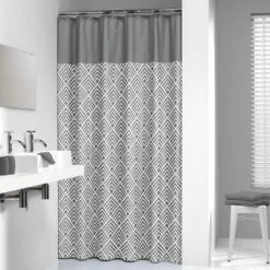 Geef je badkamer een moderne en stijlvolle uitstraling met het Sealskin Douchegordijn Angoli Grijs 180×200 cm. Het is een textiel douchegordijn gemaakt van 100% polyester en is voorzien van een waterafstotende coating. Uitgevoerd in trendy grijs en met de moderne geometrische print draagt dit product bij aan de moderne uitstraling van je badkamer. De afmeting van 180×200 cm maakt je douchegordijn geschikt voor toepassing in een nis of hoek van de badkamer. Dit product is tevens machine wasbaar op 30°C.