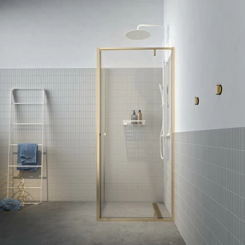 Met Contour is een luxe badkamer binnen handbereik. Dankzij haar strakke lijnen en geborstelde gouden kleurafwerking past deze draaideur met zijwand perfect in een chique badkamerstijl. Het 6 mm dikke veiligheidsglas is voorzien van een antikalklaag, waardoor je douche langer helder blijft. De deur scharniert niet direct tegen de muur, zodat de deur niet tegen een radiator of accessoire stoot. Een ding is zeker: deze douchecabine is een échte eyecatcher in de badkamer.