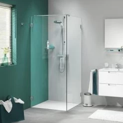 Sealskin Swingdeur voor Douchewand I AM 200×100 cm RVS, 8mm helder veiligheidsglas + antikalk. De volledig profielloze serie ‘I AM’ is met recht een transparante alleskunner. Naast diverse standaard maatvoeringen zijn talloze maatwerkoplossingen mogelijk. Zo kunnen we de breedte en hoogte aanpassen, maar bijvoorbeeld ook eventuele schuintes in de muren of het plafond opvangen. Deze draaideur, gecombineerd met een vaste zijwand, maken een moderne, transparante douche. Het veiligheidsglas van maar liefst 8mm is altijd voorzien van een antikalk laag waardoor kalk en viezigheid zich minder snel zal hechten. De scharnieren van I AM zijn zelfsluitend. Dat zorgt ervoor dat de deur automatisch naar zijn nulpunt gaat; hij gaat dus vanzelf dicht! Bovendien is dat nulpunt in te stellen. Je kunt je deur dus onder een hoek plaatsen en zo een unieke oplossing maken.I AM draaideuren voor combinatie met zijwand zijn ook beschikbaar in de standaardmaat 900mm en natuurlijk als maatwerk oplossing. De scharnieren en grepen zijn tevens beschikbaar in luxueus chroom en in een unieke matzwarte afwerking.