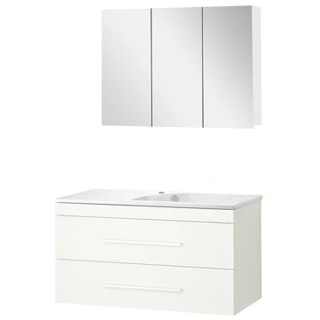 GAMMA’s witte Style-badmeubelset links is 100cm breed en is mede daardoor geschikt voor iedere badkamer. Het moderne badmeubel matcht dankzij de witte kleur met uiteenlopende badkamerinterieurs. Of je nu een grote of kleine badkamer heeft, dit badkamermeubel van de serie Style past mede dankzij de praktische vormgeving en de breedte van 100 cm bijna altijd. In de laden en spiegelkast van de badmeubelset vind je genoeg ruimte voor het opbergen van handdoeken en toiletartikelen. De laden en spiegeldeuren zijn allemaal voorzien van softclose ladegeleiders en scharnieren waardoor ze zacht en geleidelijk sluiten. Doordat het witte badmeubel is gemaakt van hoogwaardig MDF en grepen van aluminium heeft, is het een solide en duurzaam badmeubel. Let op: het kraangat zit aan de linkerkant van het wastafelblad. Deze wastafel is gemaakt van keramiek en heeft een overloop. De witte Style-badmeubelset is daarnaast verkrijgbaar met het kraangat aan de rechterkant van het wastafelblad.