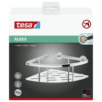 Het tesa® Aluxx hoek doucherek is gemaakt van hoogglans verchroomd aluminium en is zeer bestendig tegen roest. Het heeft een gladde bodemplaat voor een stabiele plaatsing van douchegels en shampoos. Voor het bevestigen van het rek wordt gebruik gemaakt van de gepatenteerde Power.Kit technologie. Boren is niet nodig en de muren of tegels blijven intact. Snelle montage in 3 stappen: 1) Plak de adapters op de muur en vul deze met de tesa® Power.Kit-lijm 2) Laat vervolgens de lijm 12 uur uitharden 3) Schroef het doucherekje vast op de adapters. Alle benodigde materialen zijn in de verpakking bijgesloten: hoekrek en bevestigingset. Als je wilt verwijder je het rek eenvoudig zonder lijmresten of beschadigingen. Daarna opnieuw gebruiken is mogelijk met een adapterset BK43-2, welke ook los te kopen is. Geschikt voor tegels, metaal, natuursteen, marmer, beton, hout, glas en vele soorten kunststof. Niet geschikt voor behang, stucwerk en andere oppervlakken met een antikleeflaag. Van de Aluxx productlijn zijn meerdere varianten verkrijgbaar.