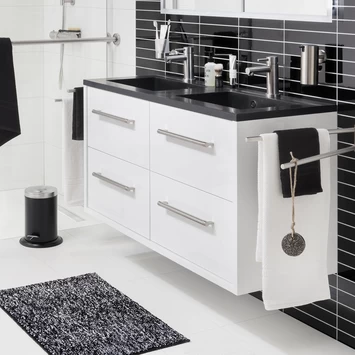 Het Tiger Boston badkamermeubel is krachtig en elegant tegelijk en de mooie ronde greep ligt aangenaam in de hand. De 4 lades bieden voldoende ruimte om alle badkamerartikelen overzichtelijk in op te bergen. Daarnaast zijn ze uitgerust met hoogwaardige ‘soft close’ geleiders waardoor ze geruisloos sluiten. De witte kleurgeeft het meubel een tijdloze uitstraling. De strakke, mat zwarte polybeton wastafel met imitatie natuursteen look maakt deze set compleet.