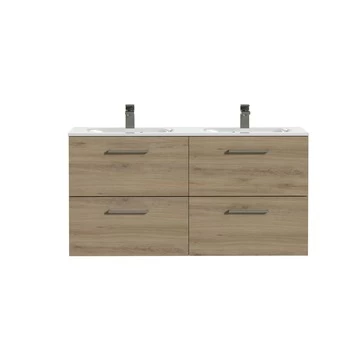 Door het strakke en tijdloze design past dit Tiger Studio badkamermeubel in iedere badkamer. Deze wastafelonderkast heeft 2 ruime lades om alle badkamerspullen overzichtelijk in op te bergen. De lades zijn uitgerust met hoogwaardige ‘soft close’ geleiders waardoor ze geruisloos sluiten. De warme houttint geeft een sfeervol karakter aan het meubel. Daarnaast krijgt het meubel, door de voelbare houtnerf, een mooie natuurlijke uitstraling. De mooie, wit glanzende polybeton wastafel met ovale waskommen en rvs grepen maken deze set compleet.