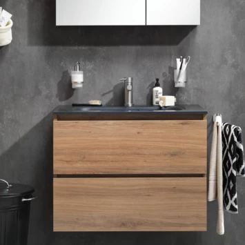 Het greeploze Tiger Karlo badkamermeubel is speciaal ontworpen voor de strakke en moderne badkamer. De wastafelonderkast heeft 2 ruime lades om alle badkamerspullen overzichtelijk in op te bergen. De lades zijn uitgerust met hoogwaardige ‘soft close’ geleiders waardoor ze geruisloos sluiten. De warme houttint geeft een sfeervol karakter aan het meubel. Daarnaast krijgt het meubel, door de voelbare houtnerf, een mooie natuurlijke uitstraling. De strakke, mat zwarte polybeton wastafel met immitatie natuursteen look maakt deze set compleet.