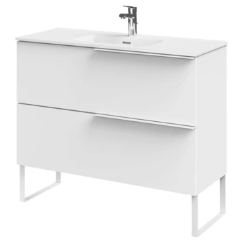 Haal het maximale uit je badkamer met deze wastafelonderkast in Scandinavische stijl. Het strakke design is simpel maar elegant. Deze slimme kast heeft een diepte van slechts 39 cm. Ideaal voor de kleinere badkamer. Dankzij haar effen lijnen laat hij de ruimte groter ogen. De ruime lades zijn uitgerust met Hettich softclosegeleiders en de binnenzijde heeft een trendy afwerking in textiel. De matwitte grepen zijn perfect in het geheel verwerkt, net als de twee speelse sierpoten. De luxueuse afwerking in hoogglans wit zorgt voor een frisse en ruimtelijke look.