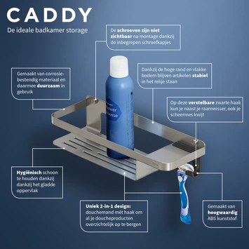 Tijdloos, uniek én multifunctioneel. Dat omschrijft het ontwerp van deze speelse douchemand mét haak van Tiger Caddy. Dit 2-in-1 design biedt naast je douchegel en shampoo ook ruimte voor je scheermes, handdoek of wisser. Zo kun je alles netjes opbergen en heb je altijd je spulletjes binnen handbereik. In de douche, bij de wastafel of in de toiletruimte. Met Caddy ga je niet alleen voor functioneel maar ook voor een tijdloze uitstraling.