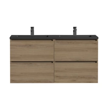 Het greeploze Tiger Karlo badkamermeubel is speciaal ontworpen voor de strakke en moderne badkamer. De wastafelonderkast heeft 2 ruime lades om alle badkamerspullen overzichtelijk in op te bergen. De lades zijn uitgerust met hoogwaardige ‘soft close’ geleiders waardoor ze geruisloos sluiten. De warme houttint geeft een sfeervol karakter aan het meubel. Daarnaast krijgt het meubel, door de voelbare houtnerf, een mooie natuurlijke uitstraling. De strakke, mat zwarte polybeton wastafel met immitatie natuursteen look maakt deze set compleet.
