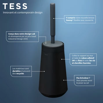 Een fris en modern gevoel in toilet of badkamer dankzij deze zwarte wc-borstelhouder van Tiger Tess. Hang hem aan de muur of zet hem neer. Plak of monteer hem met schroeven en pluggen. Het is helemaal aan jou. Deze houder is voorzien van de nieuwe Swoop® flexibele toiletborstel. Met deze innovatieve borstelkop reinig je met gemak moeilijk bereikbare plekken en dankzij de vorm en het speciale materiaal van de borstel blijft er geen viezigheid achter en druppelt hij nauwelijks na als je hem terug in de houder plaatst. Tiger Tess is innovatief en eigentijds met de herkenbare kwaliteit van Tiger.